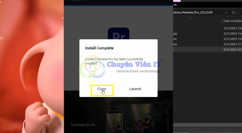 Bước 3 : Chọn Close cài đặt Premiere 2023 thành công.