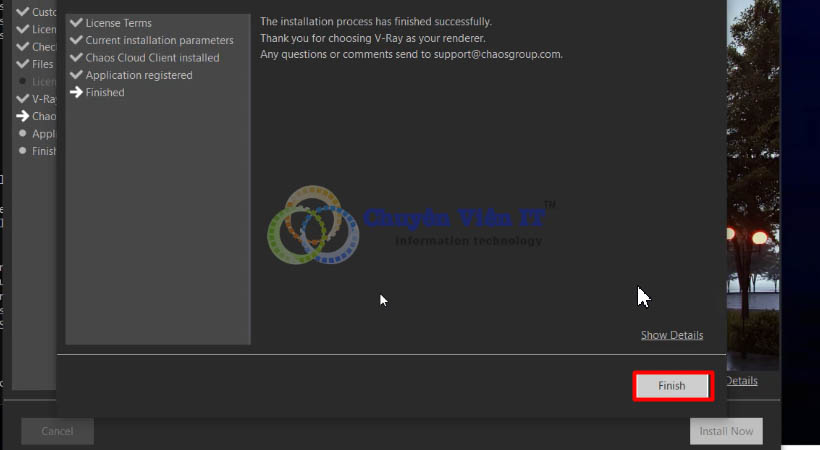 Bước 13 : Chọn Finish cài đặt thành công Vray for Revit 2018.